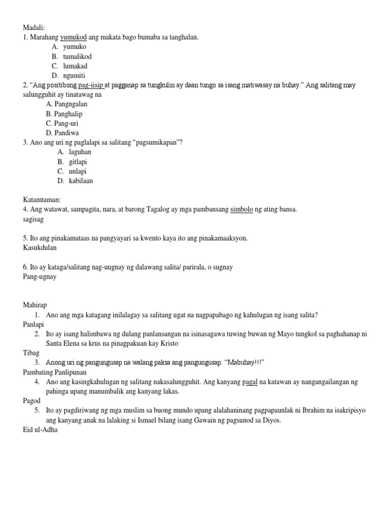 Mahalaga na sigurado sa nagiging desisyon sa buhay sapagkat ito ang susi upang makamit niya ang layunin niya sa kanyang buhay. Binubuo ng sapat na bilang ng mga tanong na makakapagbigay ng makatwiran at tamang datos sa kasanayan at kaalaman ng mag-aaral. MGA KAHULUGAN SA TAGALOG.
