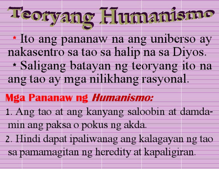 Ano Nga Ba Ang Teoryang Humanismo. Ano ang kahulugan ng teoryang realismo. V Ang layunin ng panitikan ay ipakita na ang tao ang sentro ng mundo.